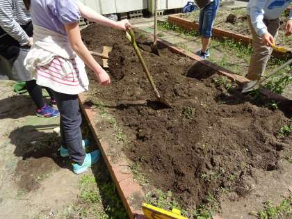5年生が花壇の整備をしていました。理科の実験で何かを育てるのでしょうか。