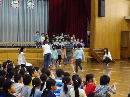 お迎え集会の様子です。1年生が6年生児童と一緒に入場しました。