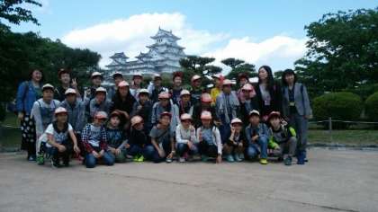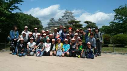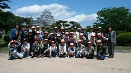 世界文化遺産・国宝姫路城に到着しました。まずは,学級ごとの記念撮影です。プロのカメラマンと旅行会社の添乗員の方にも,同行いただいています。