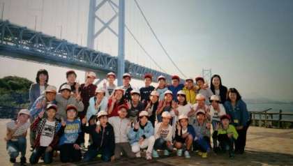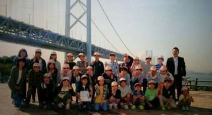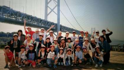 与島で瀬戸大橋を背景に,学級写真撮影をしました。