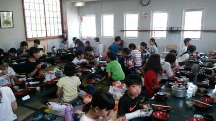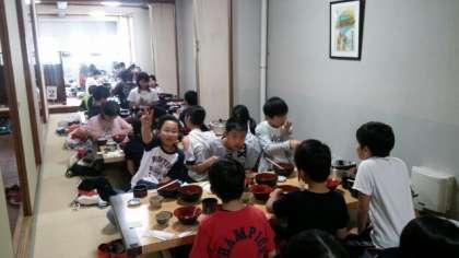 中野うどん学校で昼食を食べました。汗をかいた後なので,もりもり食べたようです。