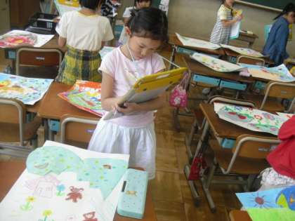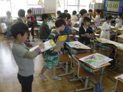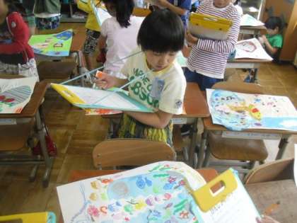 クラスのみんなの作品を鑑賞しました。それぞれ,工夫や良いところを見つけてシートに書きました。