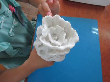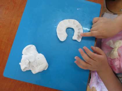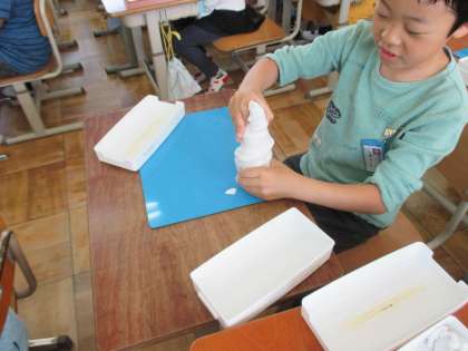 粘土をにぎって,かたちを変えました。粘土を全部使って大きなボールを作り,ひねったり,指で押したりと,思いついた形をつくりました。