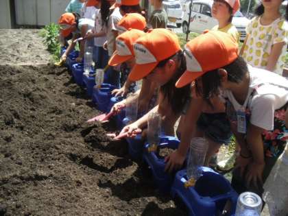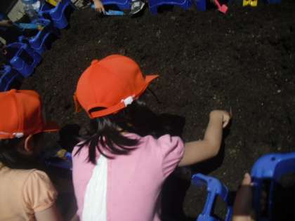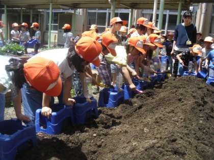 野菜づくりに向けて,1年生の時使っていた土に肥料を混ぜ,種まきスタンバイをしました。