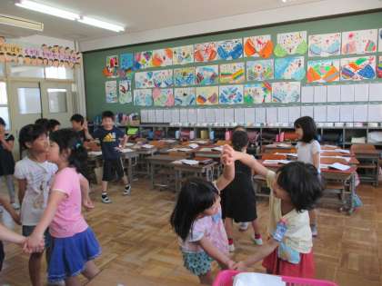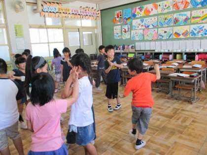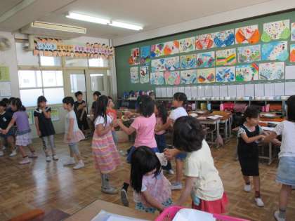 3拍子の曲「メヌエット」を聴き,音楽に合わせて体を動かしました。二人組でターンをしたり,一人でくるくる回ったりしながら3拍子を感じ味わっていました。