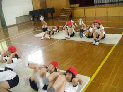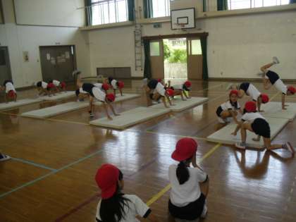 はじめの体ならしに,ゆりかごやロバキックなどを行いました。