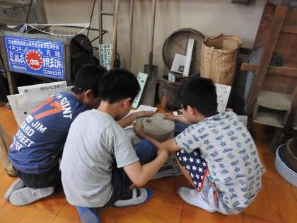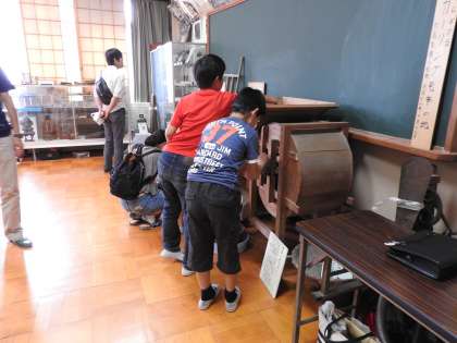 中間休みに子どもたちは,昔の道具を見たり触ったりしていました。