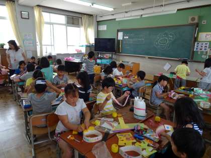図画工作の学習です。つなげ方を工夫して,変身するわっかをつくりました。