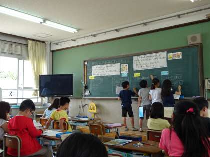 算数の学習です。問題の数量の間の関係を関係図に表して,まとめて何倍になるかのを考えて解きました。