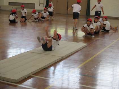 準備運動で,カエルとびやゆりかご,たわら回りをして,前転や後転の練習をしています。手の付き方やお尻の位置などに気をつけて練習しています。