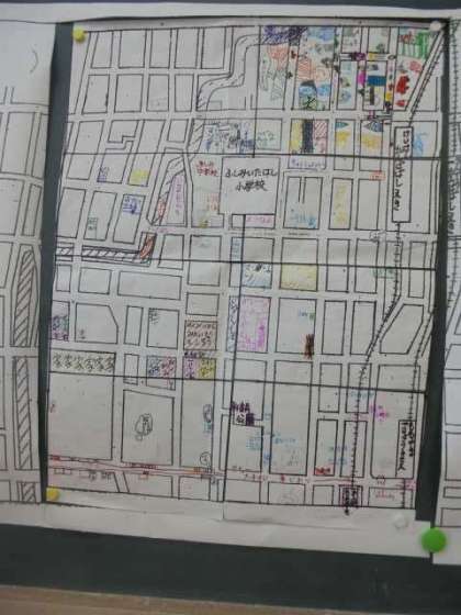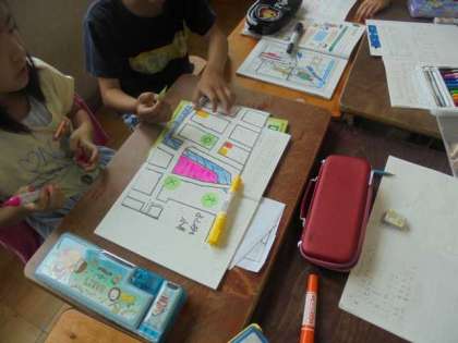 町たんけんに行って調べたことを絵地図にまとめ,さらに地図記号や色を使いながら分かりやすい地図にすることができました。