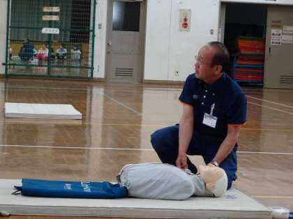 伏見消防署・伏見消防団板橋分団のみなさんのご協力のもと,普通救命講習を行いました。まずは,胸部圧迫について講習を受けました。