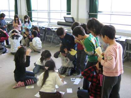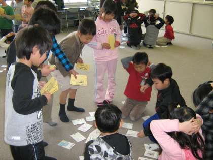 フェスティバルでは,町たんけんのまとめとしてつくった「手づくりかるた」をしたり,歌を歌ったりします。