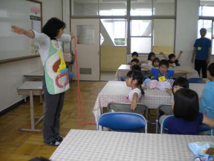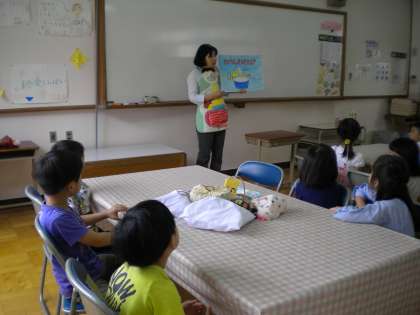 ランチルームへ行って小林先生に,食べたごはんの行方について教えていただきました。お話を聞いた後,みんなで楽しくランチルームで給食を食べました。