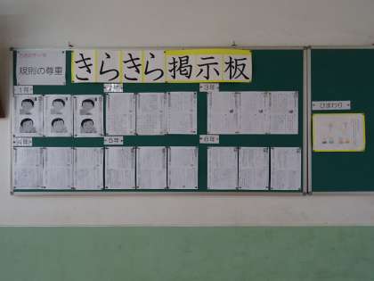 6月の北校舎1階掲示板です。5月の道徳学習について,掲示しています。テーマは「規則の尊重」です。