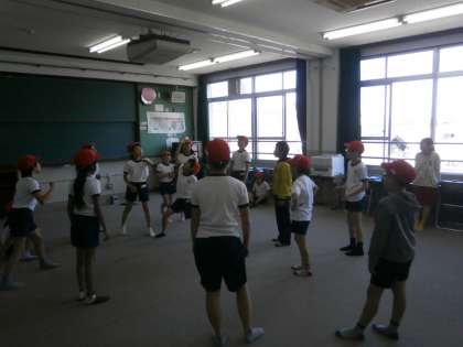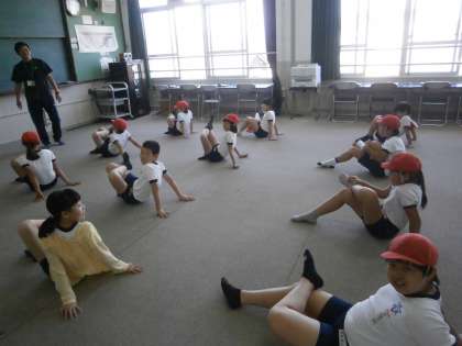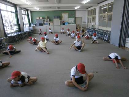 ただ柔軟をするだけでなく,自分の体の伸びているところなどを確認しながら運動をします。