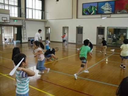 今日は,おやじの会のみなさん主催で「紙飛行機教室」がありました。新聞紙や広告紙などを使って,おもいおもいの飛行機を作りました。紙の種類や形,投げ方によってずいぶん飛び方は変わります。中には,前に飛ばした飛行機が後ろに飛ぶ子も。