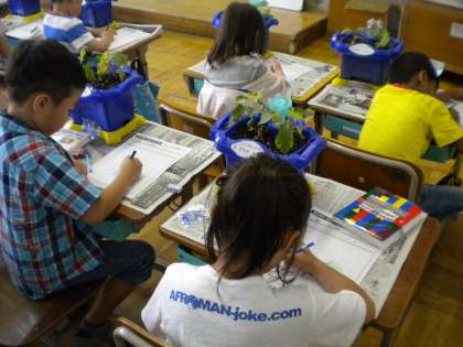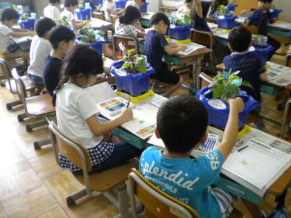 朝顔の観察をしました。つるがのびてきたので支柱を立てました。