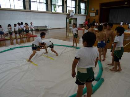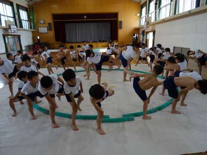 相撲部の活動です。わんぱく相撲全国大会京都府予選会に参加する児童がたくさんいます。対戦を楽しみながら活動しました。