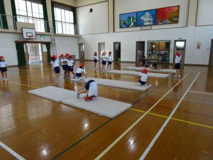 前転と後転を中心に学習活動を楽しみました。回り方をイメージして学習すると,技を身に付けやすいようでした。