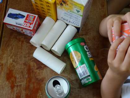 いろいろなかたちを家から持ち寄り,積んだり,転がしたりして図形に親しみました。
