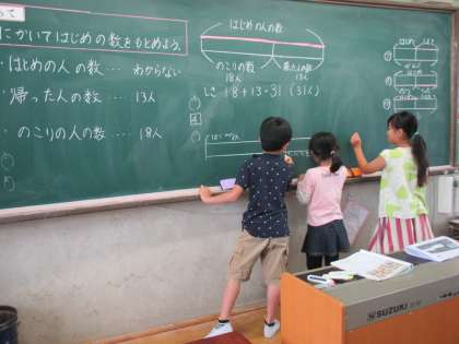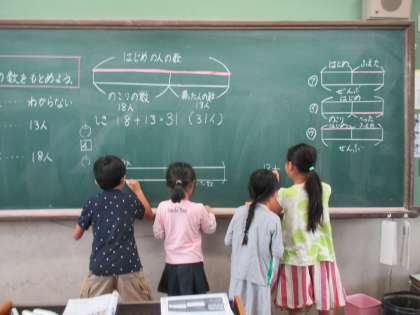 図を描いてはじめの数を求めるために,それぞれが協力して図を完成しています。