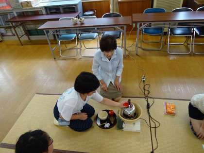 茶道クラブです。お湯を沸かして,お椀に慎重に注ぎました。