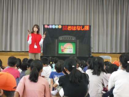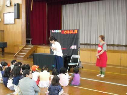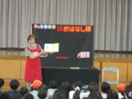 体育館では読み聞かせをして頂きました。子どもたちは,ときに笑ったり,しーんとしたり本の世界に引き込まれていました。今日読んで頂いた本は「わたしのかさ」「どすこいすしずもう」「おこだでませんように」「だいくとおにろく」「もったいないばあさん まほうのくにへ(紙芝居)」でした。
