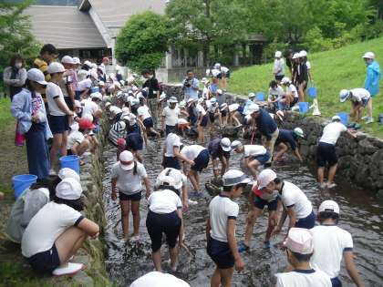 構内を流れている川にイワナを放流してもらい、魚つかみをしました。