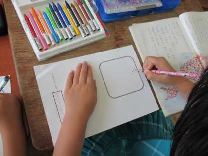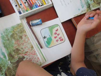 『スイミー』の感想カードに,自分が選んだ場面の絵を描いています。