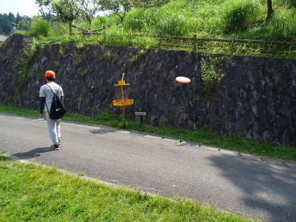 フライングディスクゴルフです。円盤状のディスクをゴールに向かって投げます。投げる角度によって,飛ぶ方向やスピードが変わります。