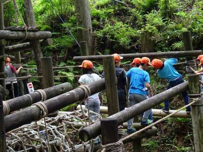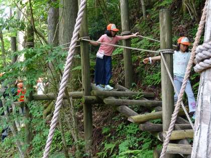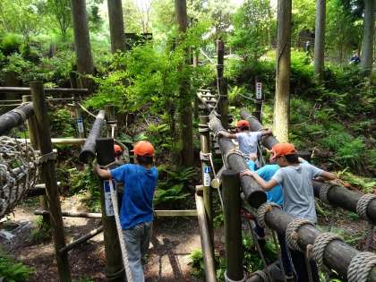 冒険の森です。子どもたちが楽しみにしていたプログラムの一つです。丸太で組まれた足場をリズムよく歩いて行きました。