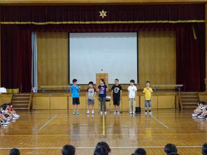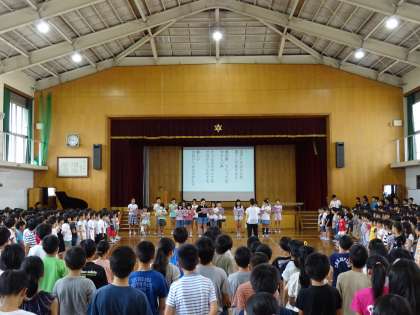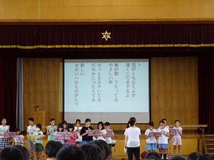 7月の児童朝会です。まずは,全校合唱からスタートです。