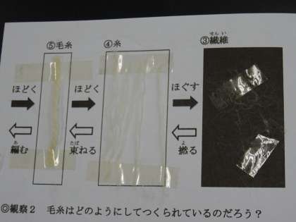 「ヒツジのおくりもの」です。ヒツジの生態について知り,羊毛の標本から特徴を考えました。