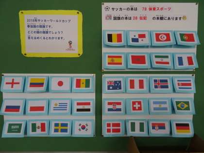 夏休みの学校図書館の掲示物です。サッカーワールドカップにちなんで,国旗についての掲示がされていました。