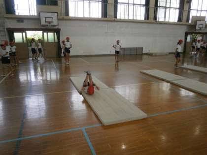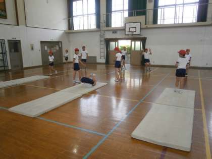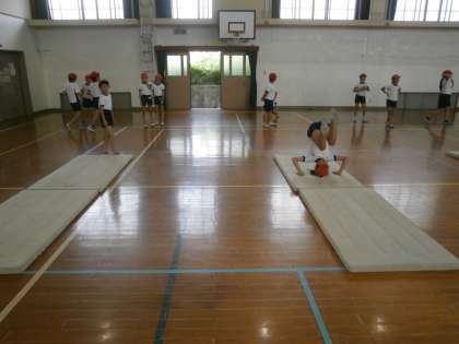 5年生になって,飛び込み前転,倒立前転など難しい技にも挑戦していきます。