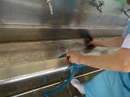 給食調理員さんが手洗い場の清掃をしていました。ぴかぴかになりました。