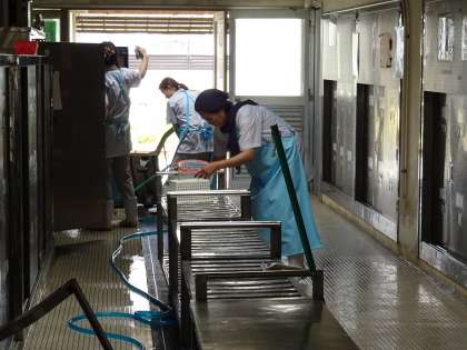 給食室のホールも丹念に清掃しました。明日は笑顔の子どもたちが給食を楽しみにやって来るでしょう。