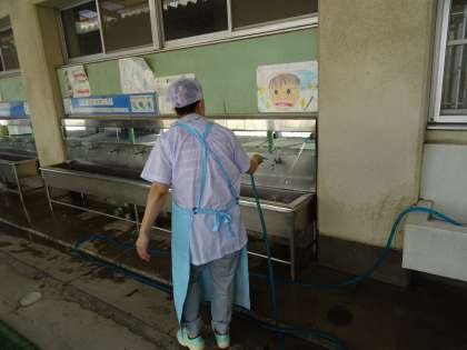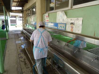 給食室前の手洗い場も砂まみれになっていました。再び清掃しました。