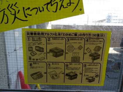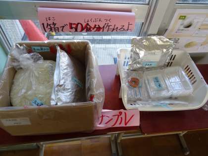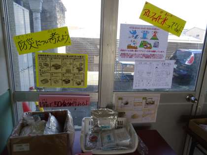 アルファ化米について,昇降口にサンプルを置いています。防災について考えるよい機会になればと思います。