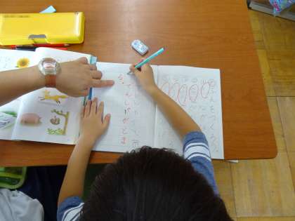 先生とお手本を見ながら,ひらがなの学習をしました。