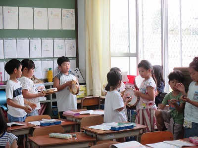 グループで楽器を分担し,1拍目を打つ人,2拍目を打つ人に分かれ,2拍子の曲「この空とぼう」にリズム伴奏をつけました。