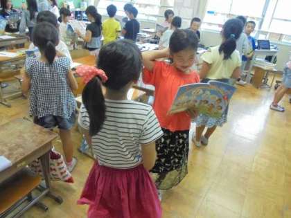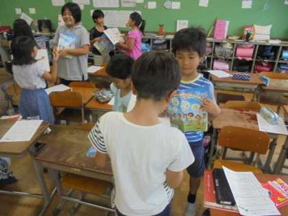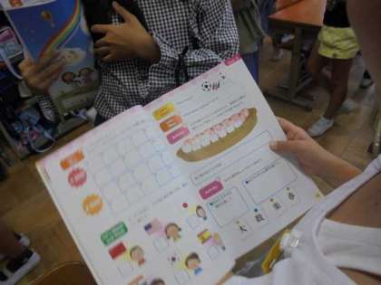 友だちに色を塗ったりんごの数を尋ねて,自分と同じ数のペアを作りました。