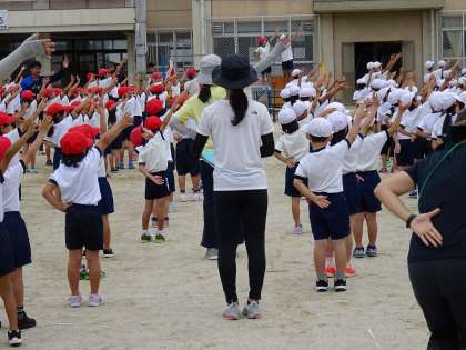 全校演技・準備運動です。係の子どものお手本を見て,演技します。