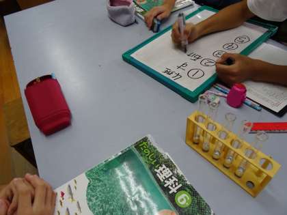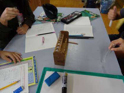 身の回りにある水溶液を探し,区別する方法について話し合いました。
