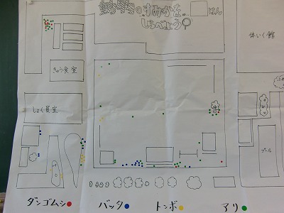 生き物を見つけた場所にシールで印をつけていきます。色を変えることでどこにどんな生き物がいるのかがよくわかりました。
