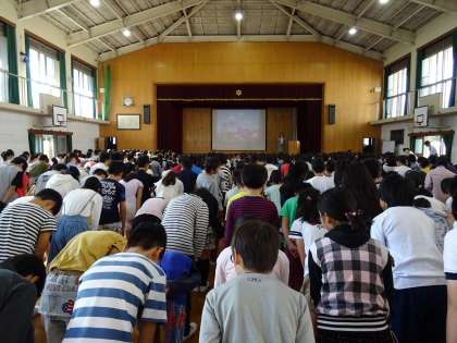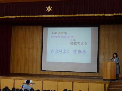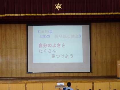 10月の朝会の様子です。校長先生から自分のよさを見つけ,周囲の人のために役立てることについてのお話がありました。