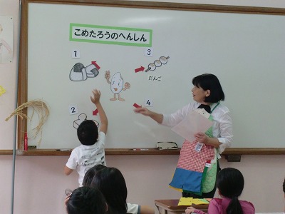 今日は,ランチルームで「お米のパワー」について学習しました。お米が何に変身するかやお米の持っているすごいパワーについて知ることができました。お米のおいしい季節です。ごはんもしっかり食べてたくさんの「お米パワー」を吸収したいです♪