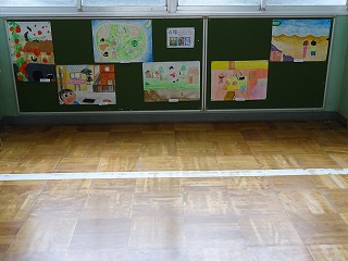 4年生の掲示板です。お話の絵が掲示されています。