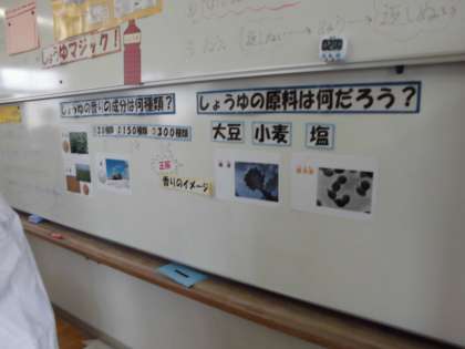 そうですね。大豆・小麦・塩からつくられています。大豆や小麦の量によって,濃口や薄口,色の違いなどがあるそうです。香りの成分が300種類あるのも驚きでした。